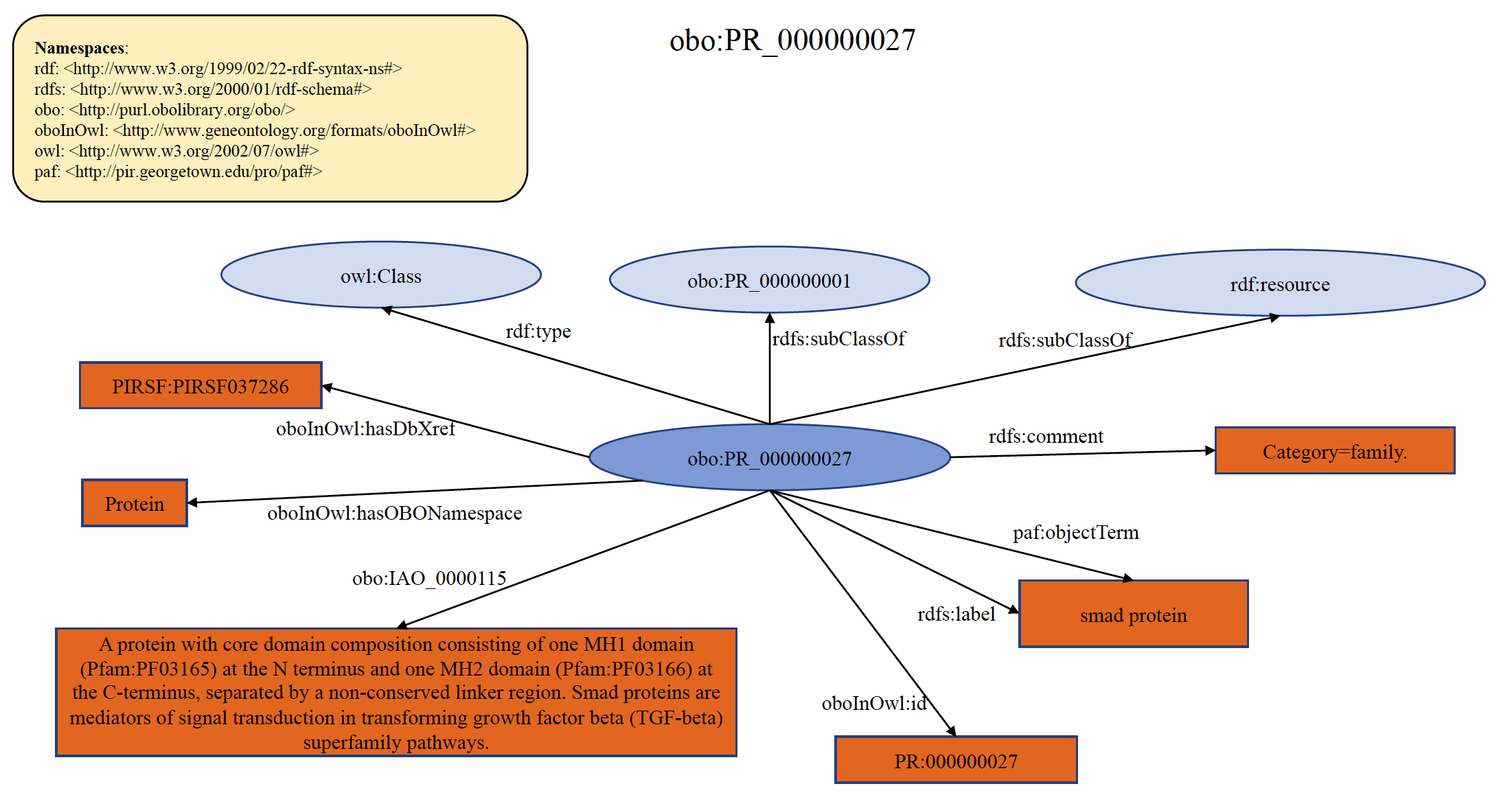 Each PRO term at family level refers to protein products of a distinct gene family arising from a common ancestor. The leaf-most nodes at this level are usually families comprising paralogous sets of gene products (of a single or multiple organisms). For example, smad2 and smad3 both encode proteins that are TGF receptor-regulated while smad1, smad5, and smad9 are all BMP receptor-regulated. Thus, "TGF-beta receptor-regulated smad protein" and "BMP receptor-regulated smad protein" are terms denoting distinct families. Note that this level collectively refers to any such grouping at any level of similarity. For example, the two families indicated above can merge into a "receptor-regulated smad protein" class and further merge (with the protein products of smad4, smad6, and smad7) into the "smad protein" class. An example of organism non-specific PRO family term PR:000000027 is shown below in RDF Graph, RDF/XML and Turtle formats.