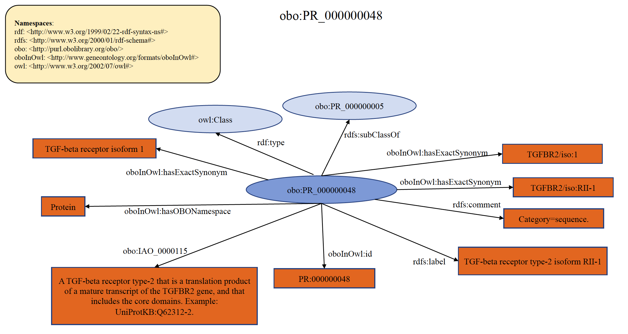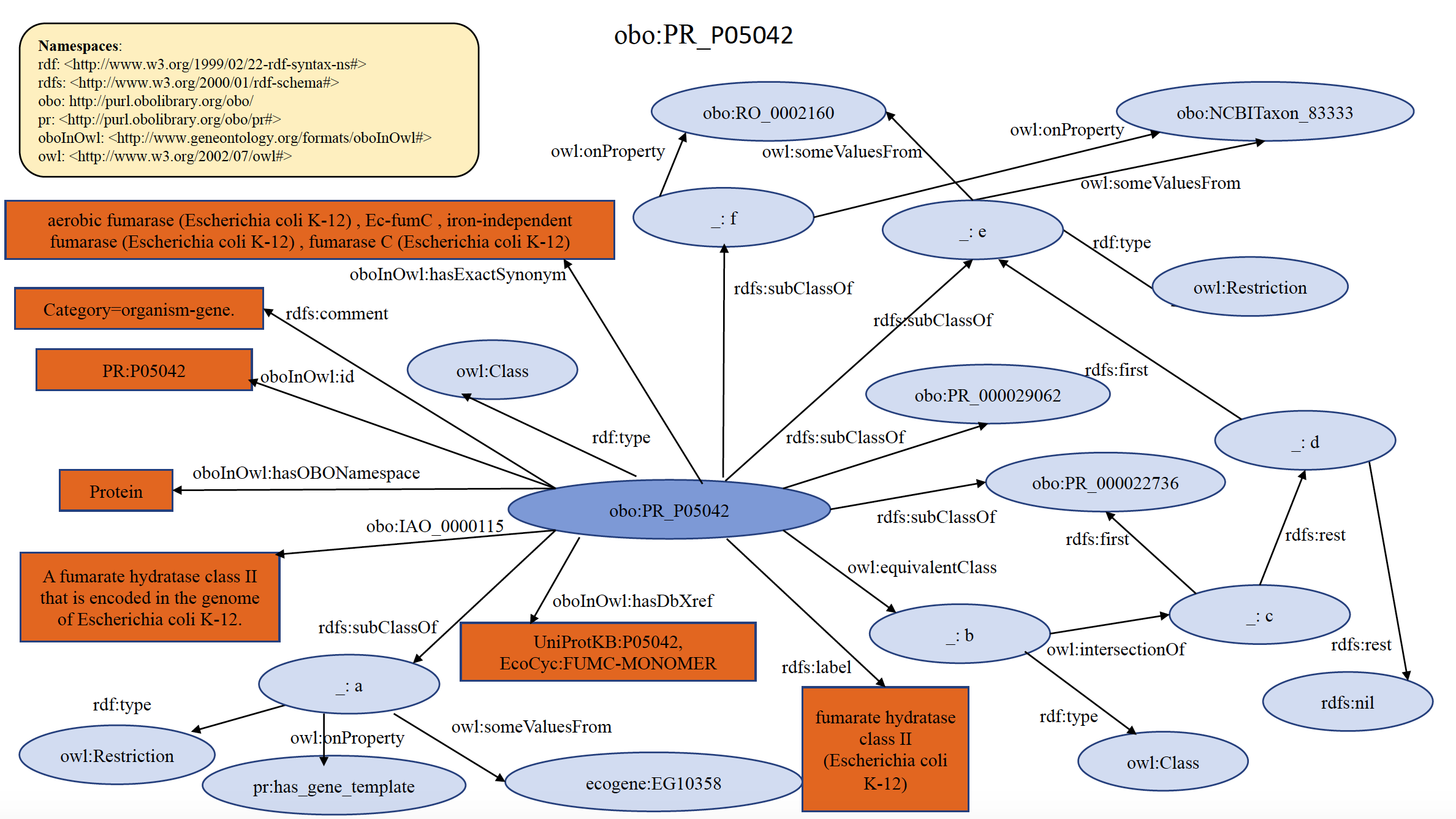 An example of organism specific PRO gene term PR:P05042 is shown below in RDF Graph, RDF/XML and Turtle formats.