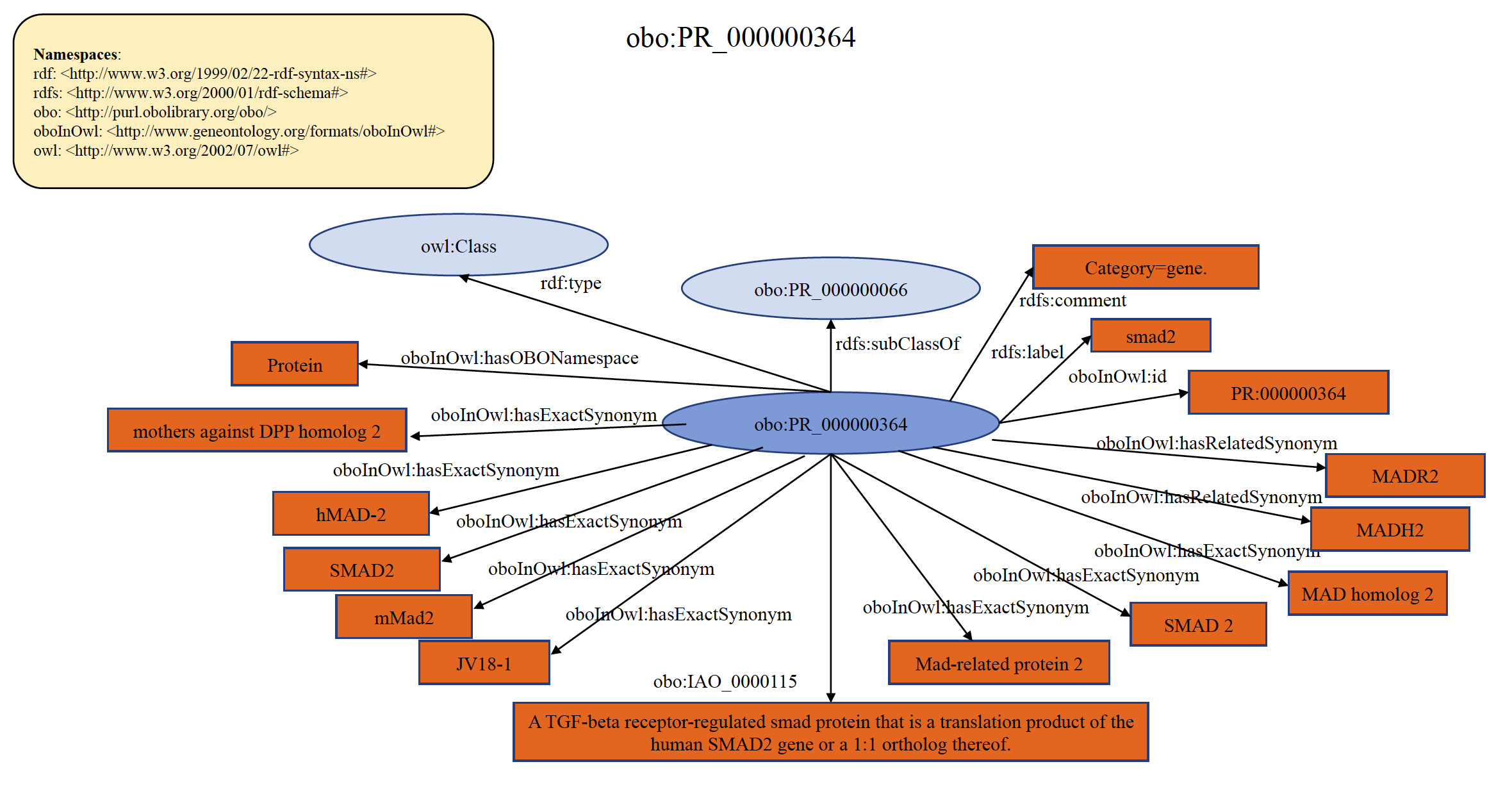 Each PRO term at gene level refers to the protein products of a distinct gene in a reference organism and the orthologs thereof. For example, "smad2" and "smad3" are two different genes, and therefore have two different PRO entries at the gene level of distinction. The protein products of what is recognized as smad2 in humans and what is recognized as smad2 in mouse fall under the single gene-level term “smad2”. Thus, a single term at the gene-level distinction collects the protein products of (usually 1-to-1) orthologs for that gene. Organism-specific versions are (typically) defined logically as the intersection of the parent (gene-level) and the organism (taxonomic) terms. If a resource provides gene information, PRO will indicate this using the has_gene_template relation. An example of organism non-specific PRO gene term PR:000000364 is shown below in RDF Graph, RDF/XML and Turtle formats.