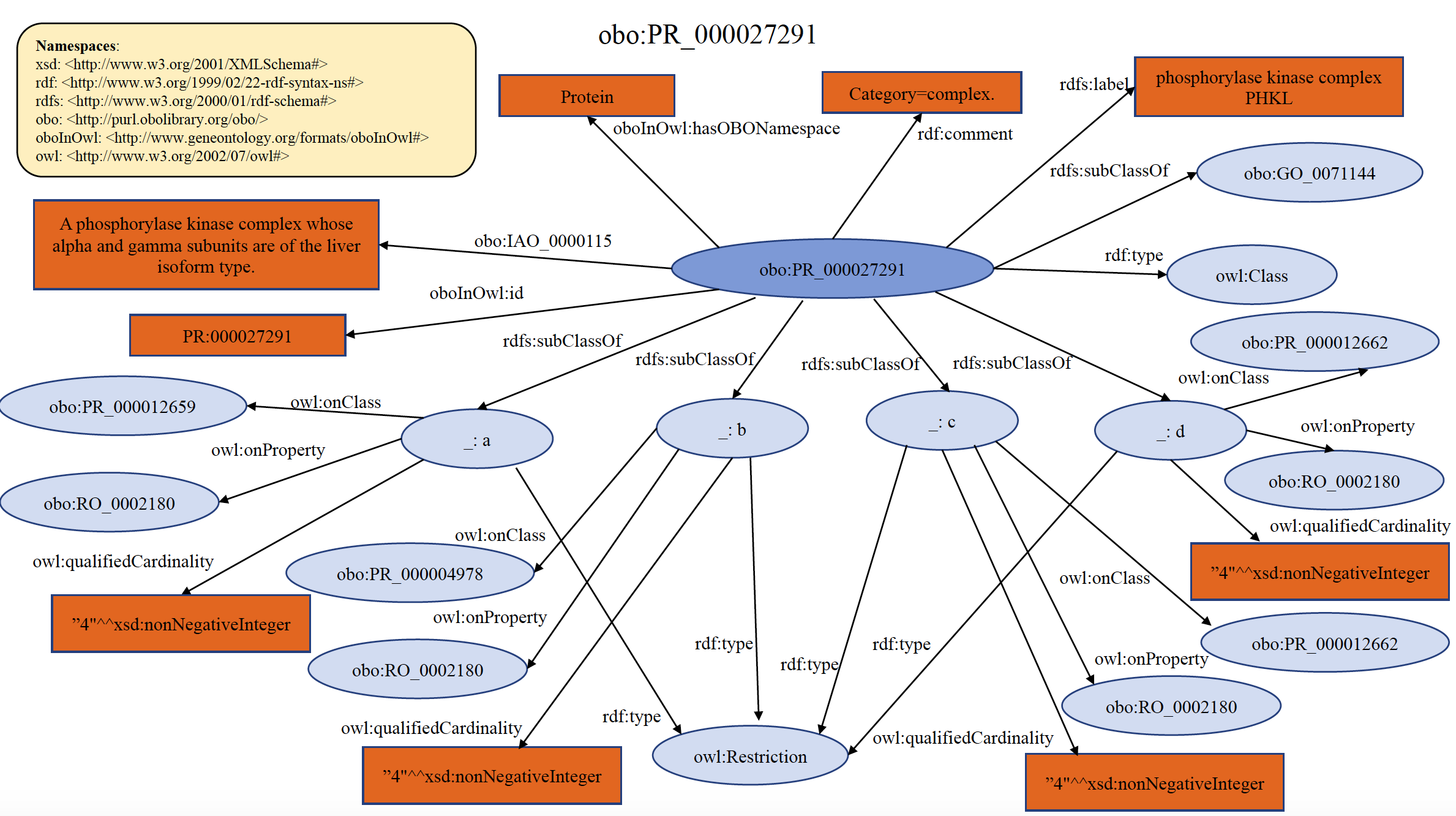 Each PRO term at the complex level ultimately traces to the general term "protein-containing complex" found in GO (GO:0032991), defined as "A stable assembly of two or more macromolecules, i.e. proteins, nucleic acids, carbohydrates or lipids, in which at least one component is a protein and the constituent parts function together". Indeed, complex-level terms in PRO are imported from GO whenever possible. However, because GO complexes are (predominantly) defined with respect to function, PRO will create complex terms when a component-specific definition is desired. When doing so, PRO represents complexes explicitly--that is, by subunit composition--defining each member of the complex at the level of its isoform, variant, or modified form, whenever possible. Most complex-related terms defined by PRO are species-specific. Note that a protein in its monomeric state, linked non-covalently to a small chemical, is not considered a protein complex by the above definition, but it can be defined as a subclass of the protein term using the CHEBI ID for the small chemical and the relation “non-covalently_bound_to”. An example of organism non-specific PRO complex term PR:000027291 is shown below in RDF Graph, RDF/XML and Turtle formats.