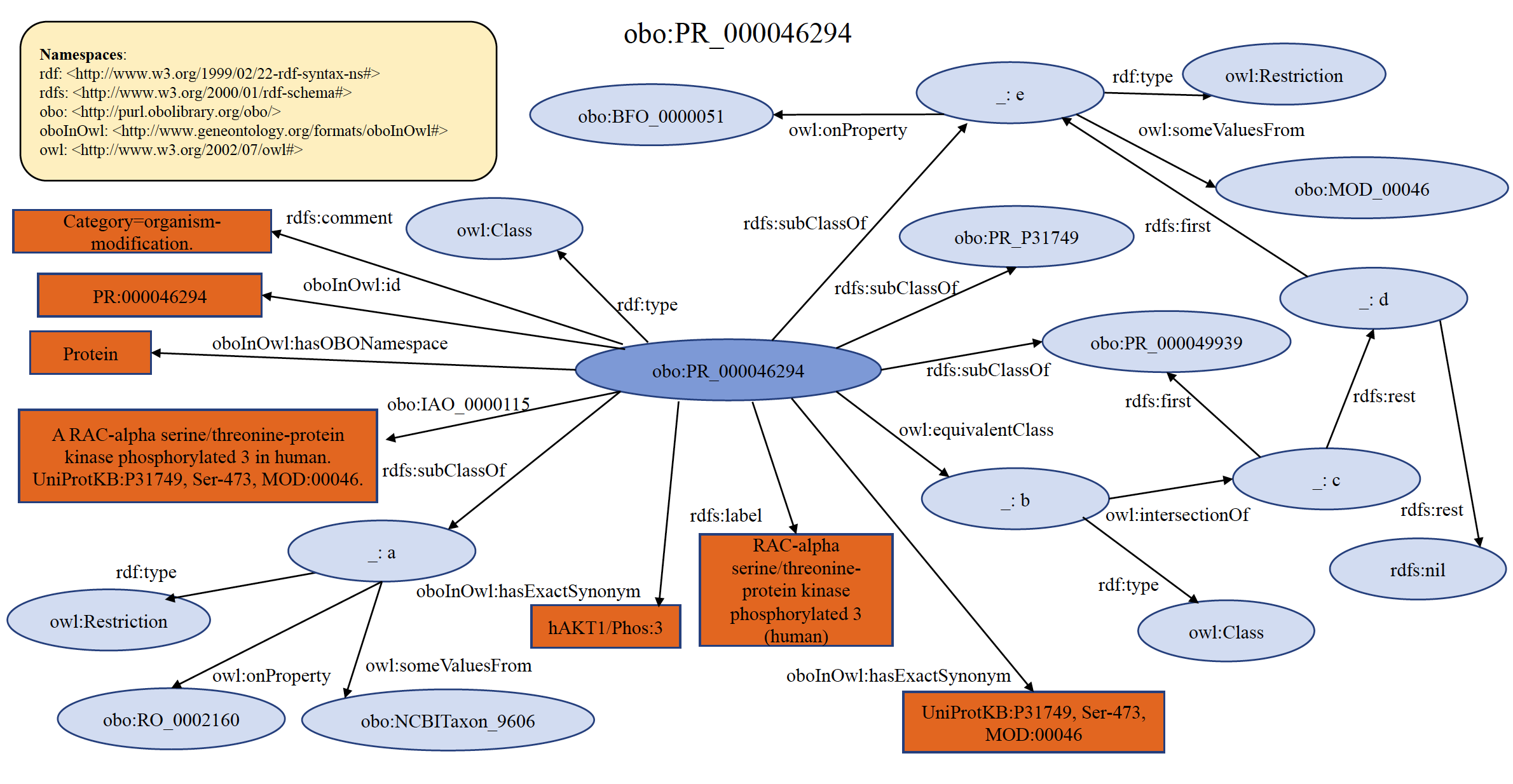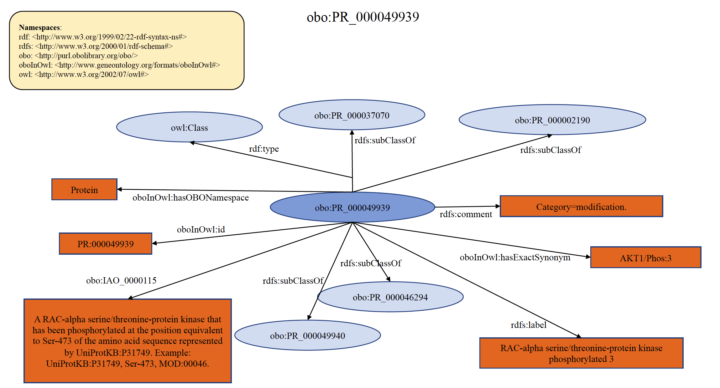 Each PRO term at this level refers to the protein products derived from a single mRNA species that differ because of some change (or lack thereof) that occurs after the initiation of translation (co- and post-translational). This includes sequence differences due to cleavage and chemical changes to one or more amino acid residues. In general, PRO does not provide time or space information, i.e., the order in which modifications occur or the location in which they are found unless such are required to properly define the term. PRO only represents the final modified objects, which are relevant for function. If there is clear knowledge on the equivalency of the modified forms from different organisms, then the equivalent terms are defined as children of the modification level terms. For example, RAC-alpha serine/threonine-protein kinase phosphorylated 3 from human (PR:000046294) and mouse (PR:000049940) are ortho-modified forms that are phosphorylated on the position equivalent to Ser-473 of the human protein. In the PRO hierarchy, they are children of the modification level term PR:000049939. If the equivalency of the modified forms is not well-established, the organism-modification term is defined as a child of the organism-gene level. An example of organism non-specific PRO modification term PR:000049939 is shown below in RDF Graph, RDF/XML and Turtle formats.