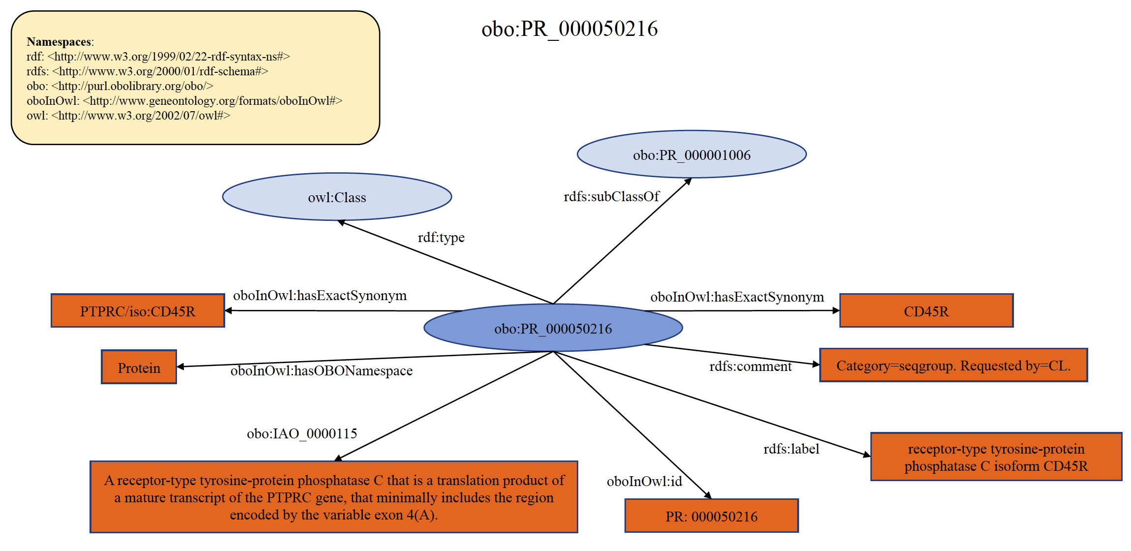 Each PRO term at the seqgroup level refers to proteins encoded by the same gene that are distinguished from siblings based on differences in shared portions of encoding mRNAs. That is, all members of a given seqgroup are encoded by mRNAs that have a common subset of sequence features, either as a common subset of exons or as a common subset of sequence variations. Examples include proteins encoded by the PTPRC (CD45) gene, where each member of the CD45R subtype (CD45RA, CD45RAB, CD45RAC) minimally contains exon 4 (aka ‘A’) even while each member of a given subtype has other exons that make them distinct, and histocompatibility genes such as HLA-A, where each member of a given subtype (HLA-A*24, HLA-A*68, etc) shares a common set of variations even while each member of a given subtype has other variations that make them distinct. An example of organism non-specific PRO sequence term PR:000050216 is shown below in RDF Graph, RDF/XML and Turtle formats.