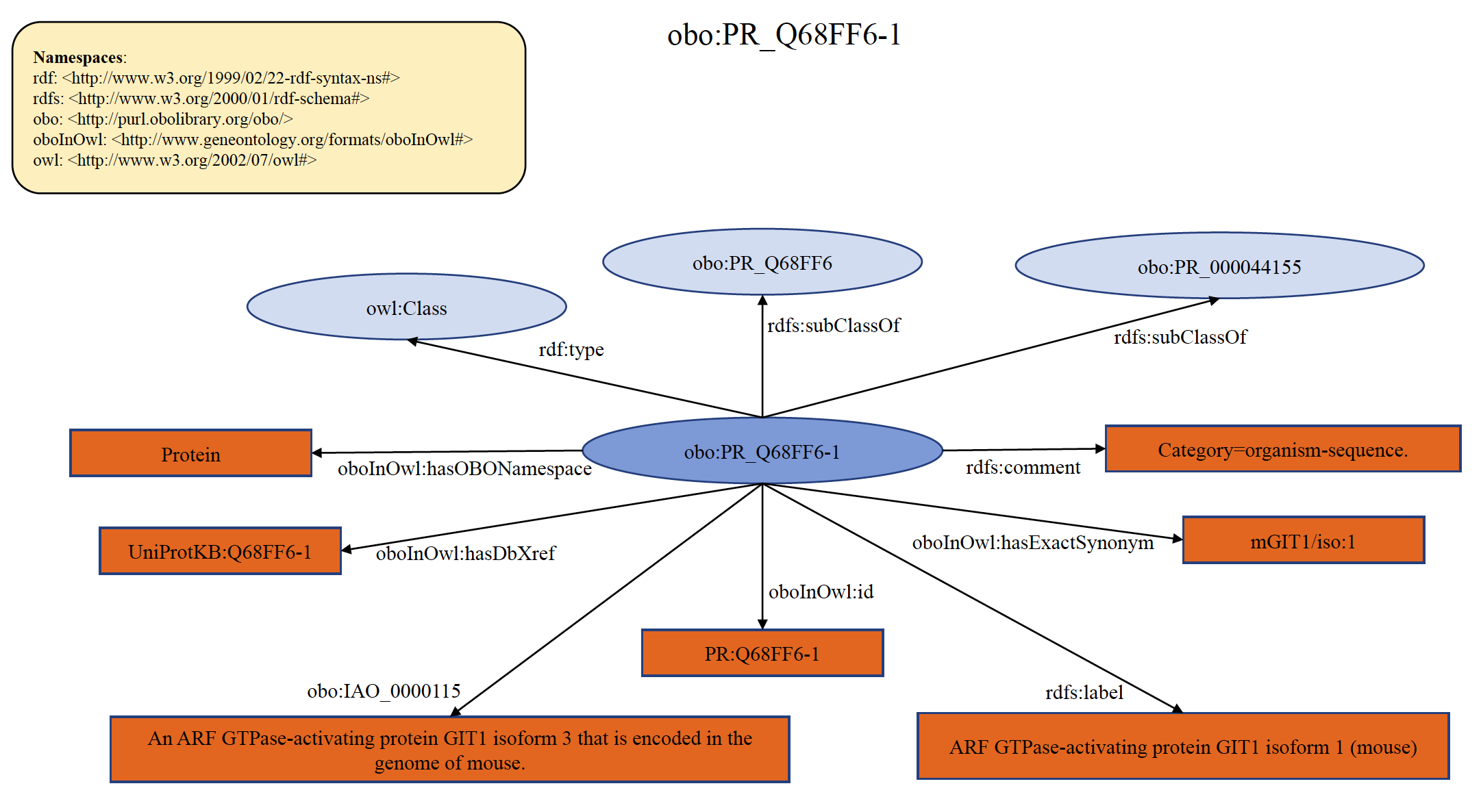 An example of organism specific PRO seqeunce term PR:Q68FF6-1 is shown below in RDF Graph, RDF/XML and Turtle formats.