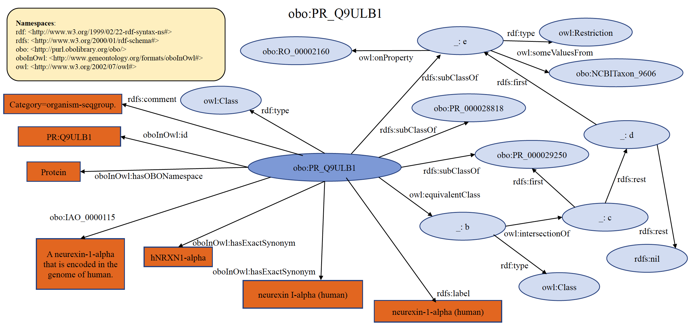 An example of organism specific PRO seqgroup term PR:Q9ULB1 is shown below in RDF Graph, RDF/XML and Turtle formats.